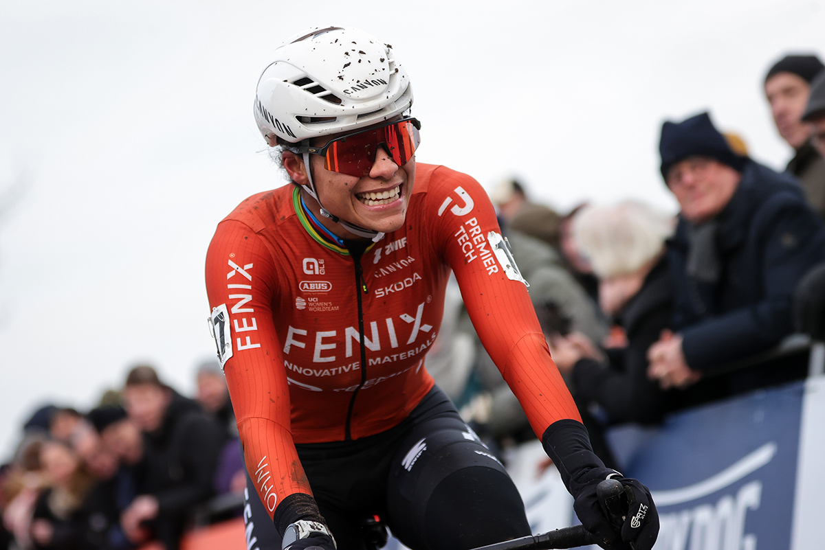 Puck Pieterse soloed to her first 2025-2026 UCI World Cup victory in Maasmechelen, Belgium. “It’s a big relief to win a World Cup again, last cyclo-cross season I couldn’t win one and it made me realize how special it is as well in ‘cross to win a World Cup,” she said after the race.